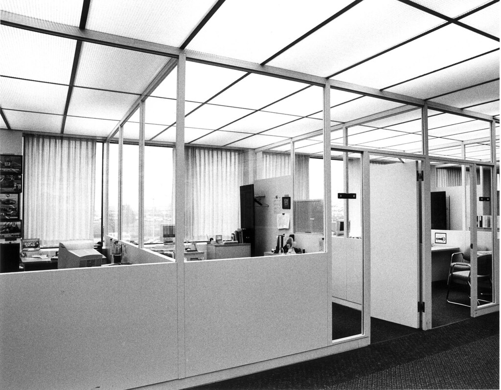 A cultural stereotype is generated that produces an identification between the subject and their work environment. (Fig.1) Eero Saarinen, a former member of the OSS (Office of Strategic Services, the precursor to the CIA), is one of the principal figures responsible for creating this “new symbolism” through the design of workspaces in the military-industrial complex. (Fig.5) The grid aesthetic is present in the headquarters of major corporations. (Fig.7) The representation of a continuous floor or ceiling plan, technologized and homogenized, is constant. The grid, modulation, and the implied flexibility in systematization transform into “the image—and the instrument—of the ‘organizational complex’.” The grid does not appear as an element of universal ordering but as one of universal homogenization. It is the inner logic of space in the information age.