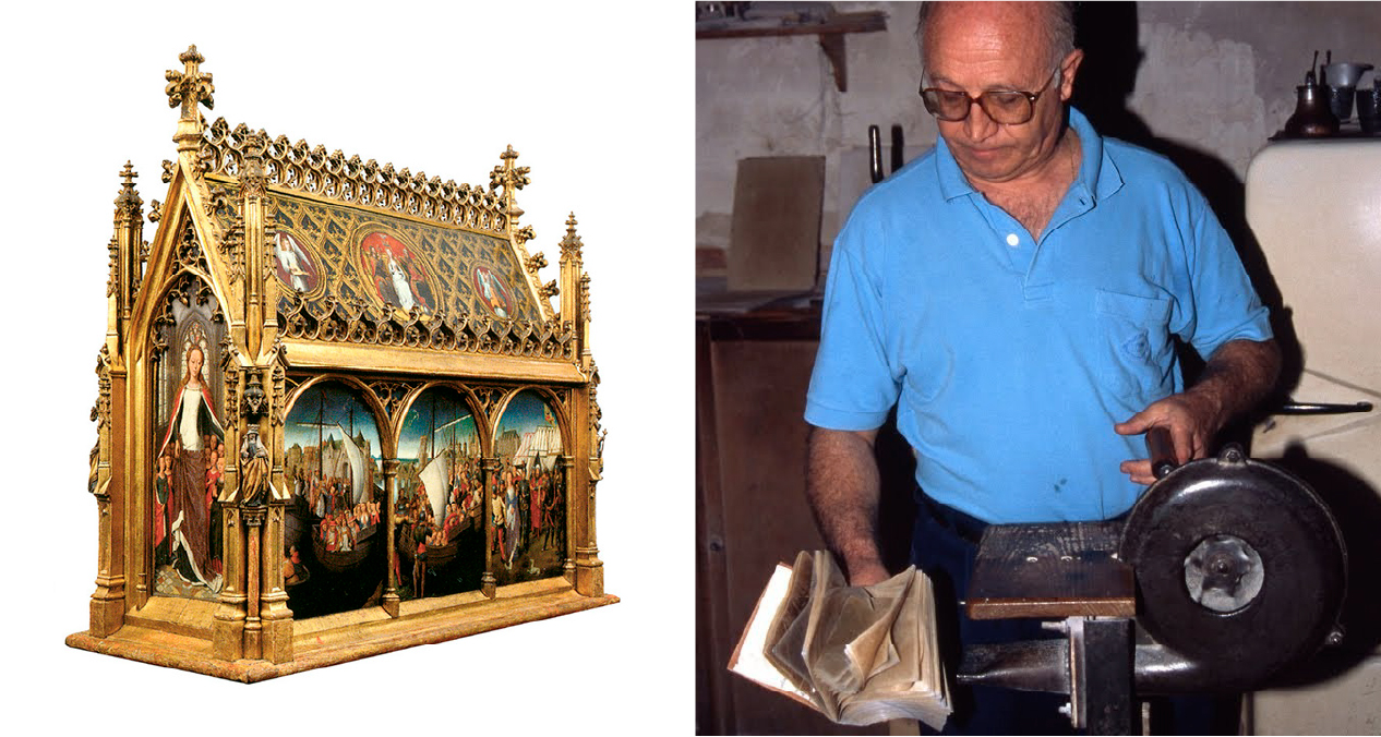 The Saint Ursula casket is a reliquary measuring 87 x 33 x 91 cm, made of carved and gilded wood, with oil-painted panels depicting scenes from the story of Saint Ursula, by Hans Memling. It dates to around 1489.