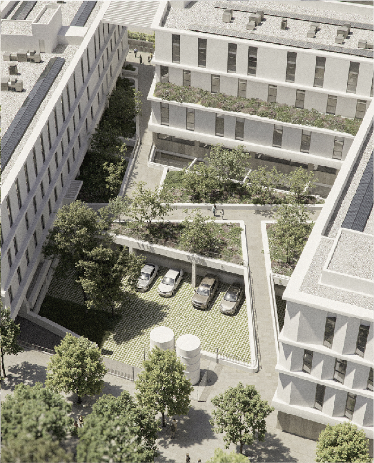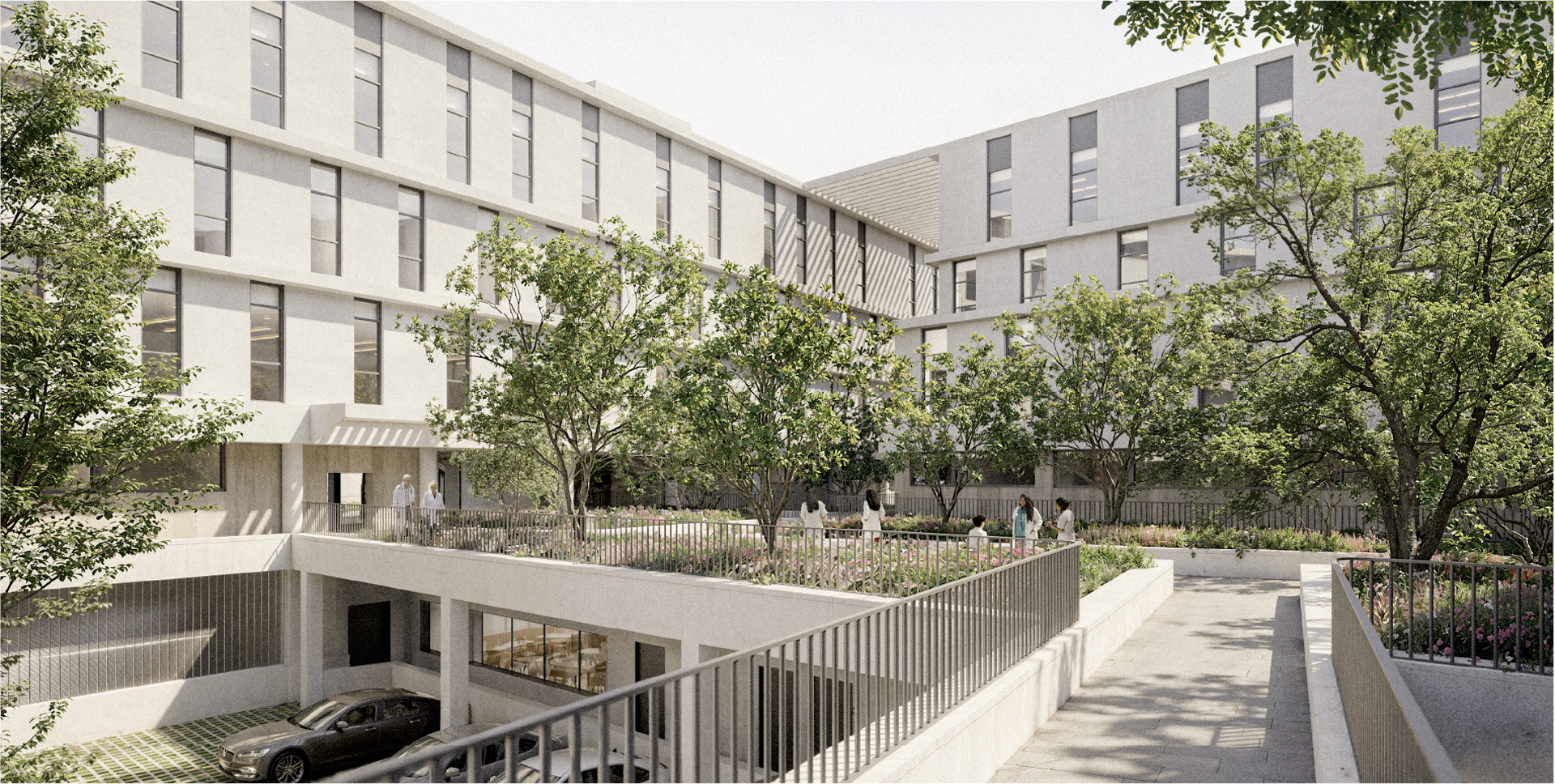 The multi-level courtyard design responds to the hospital’s internal logistics—separating flows of people and goods across two levels. At the same time, it reconciles urban planning requirements for permeable ground with geotechnical constraints, such as a high water table just above the second basement level.