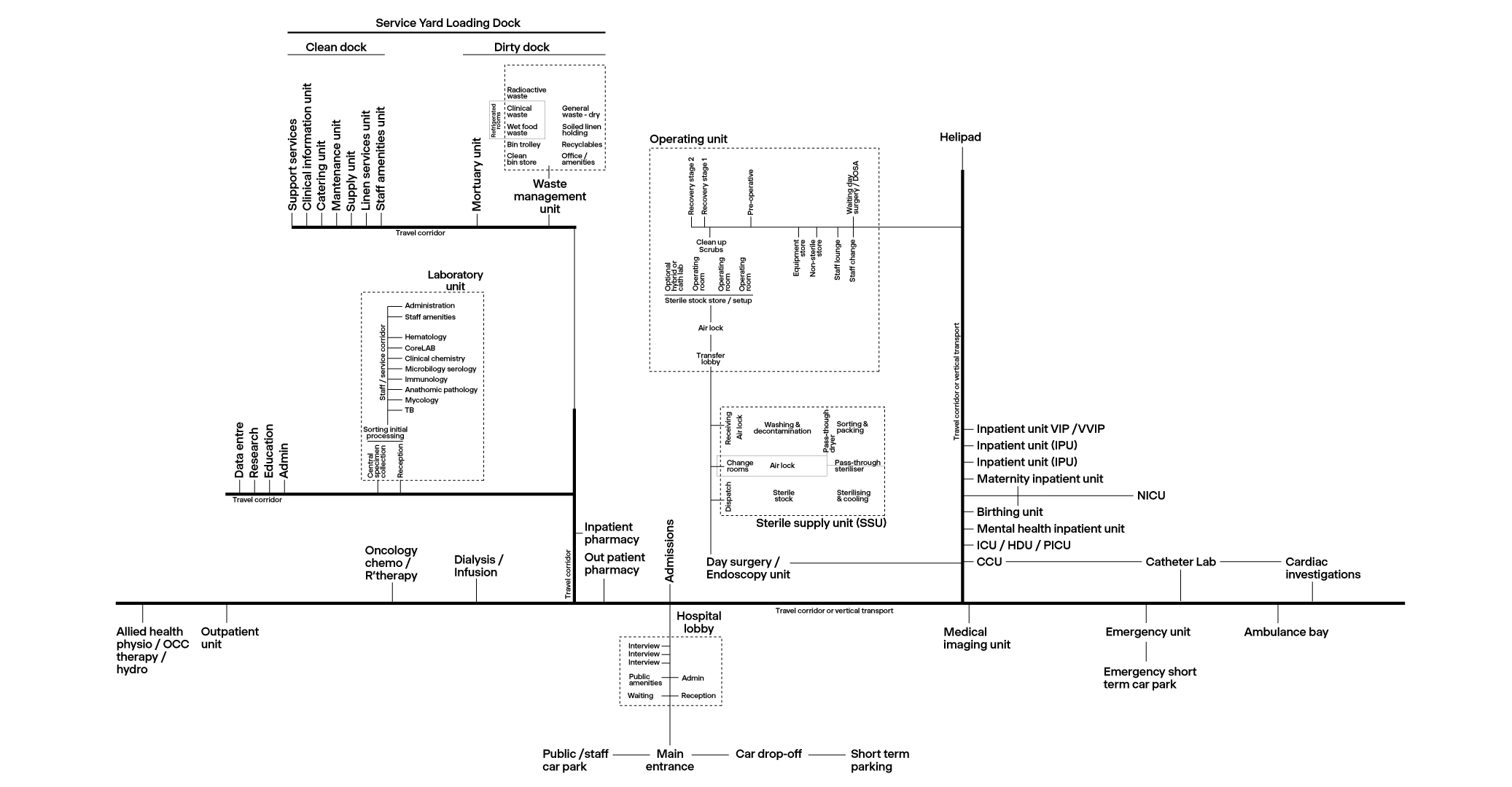 Within this predefined envelope by urban planing, architecture becomes a space of negotiation—an exercise in mediation between capital, care, and regulation. And perhaps there is yet another layer of authorship: that of the ailing body the hospital is ultimately built to host. That of the machines—imposing spatial, structural, and material constraints to accommodate radiation shielding, magnetic fields, and surgical precision; and that of the ground itself.