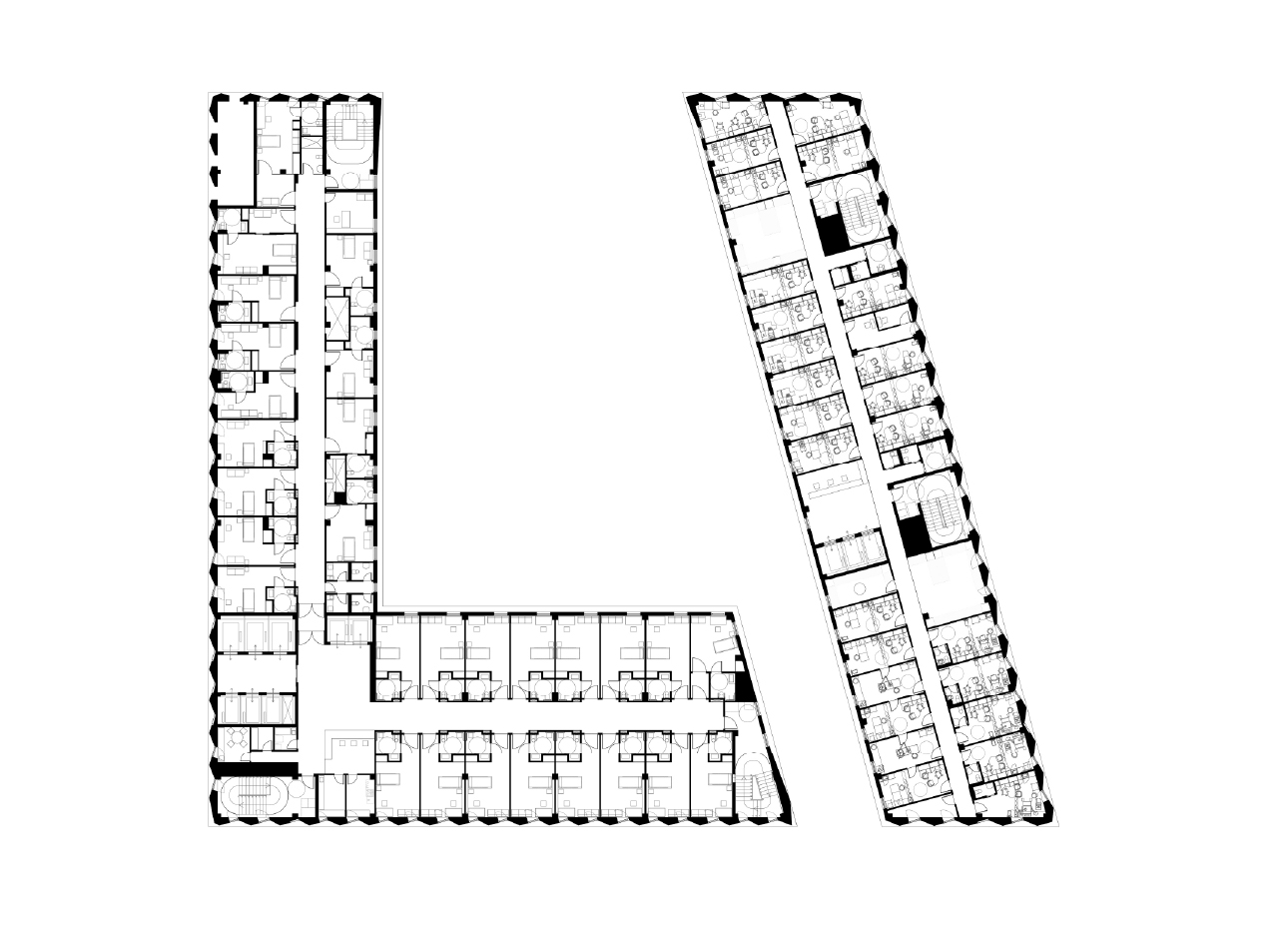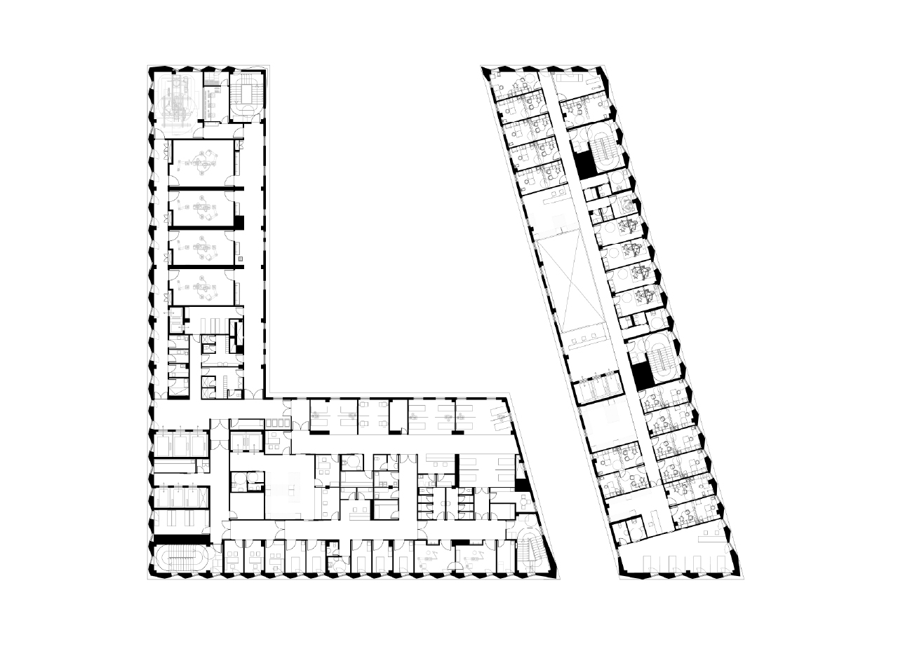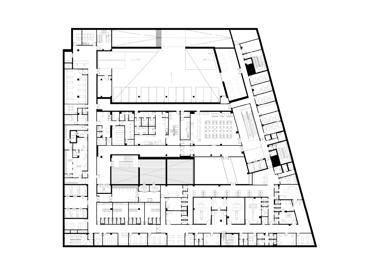 The hospital’s floor plan is the negotiated outcome of all these forces. The functional program was continuously adjusted to fit the urban constraints, through successive rounds of design and dialogue with the client.