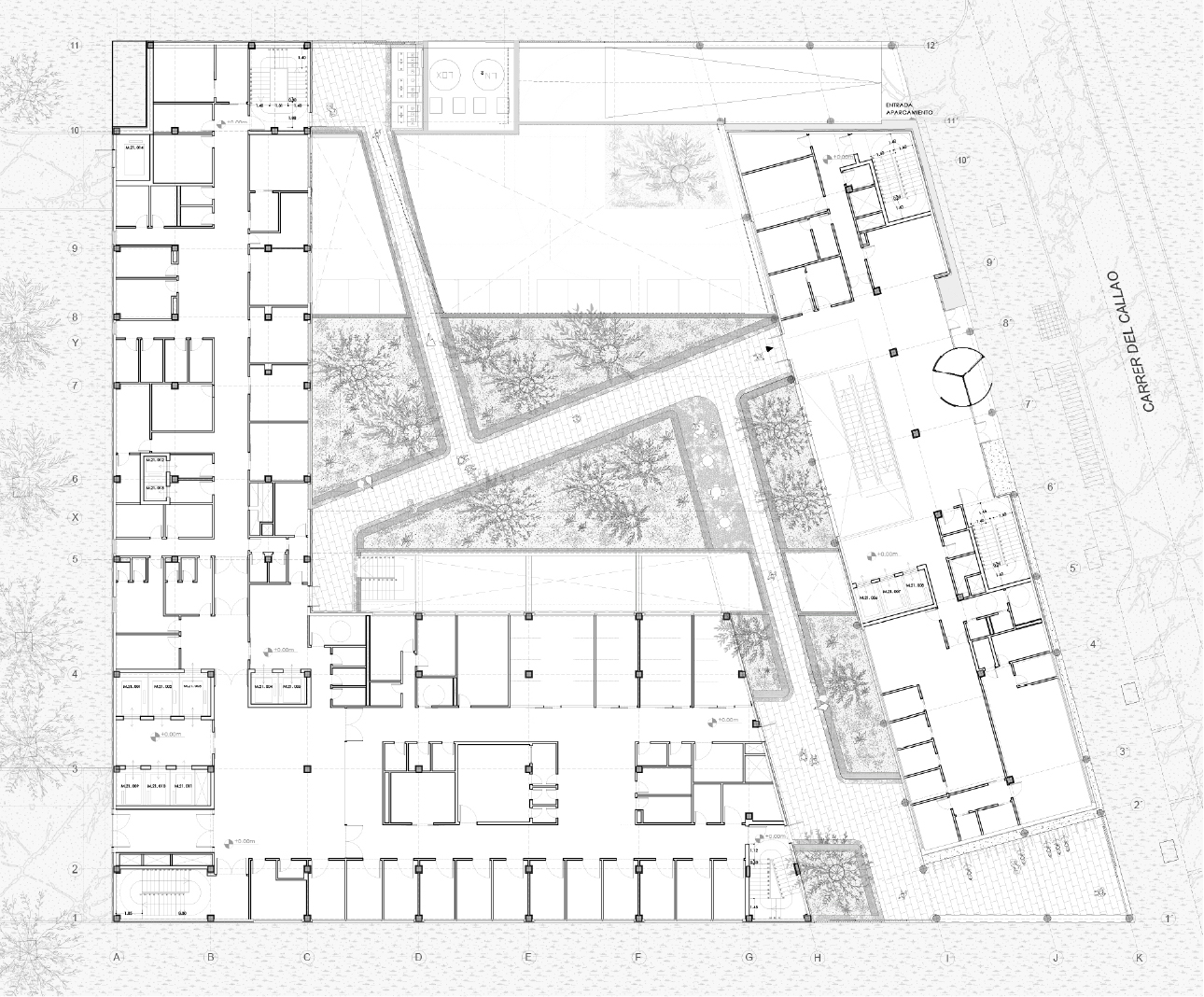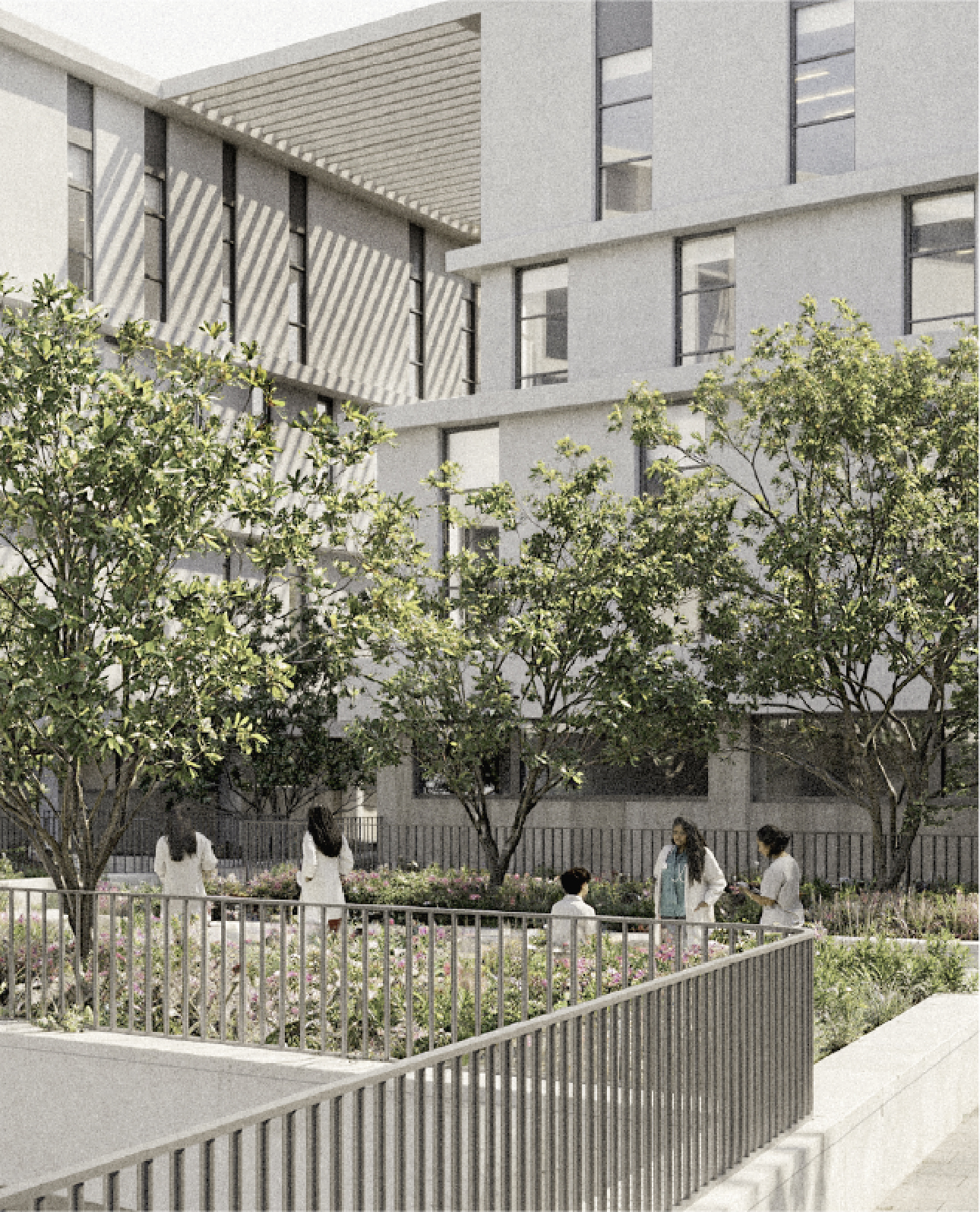 It is within this semi-enclosed block, set behind these infrastructural and symbolic thresholds, that the hospital situates itself—responding to the tension between the metropolitan scale of infrastructure and the intimate scale of care See AlsoSoft Against Sharp .