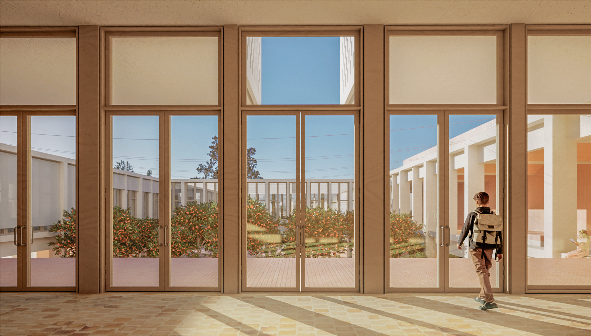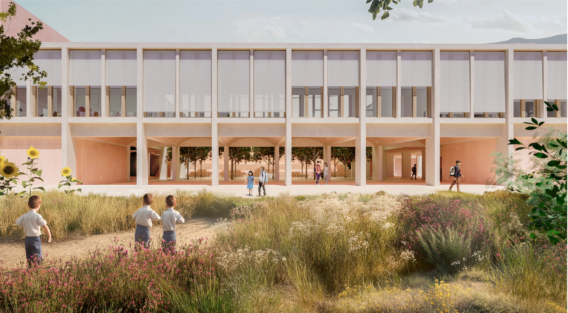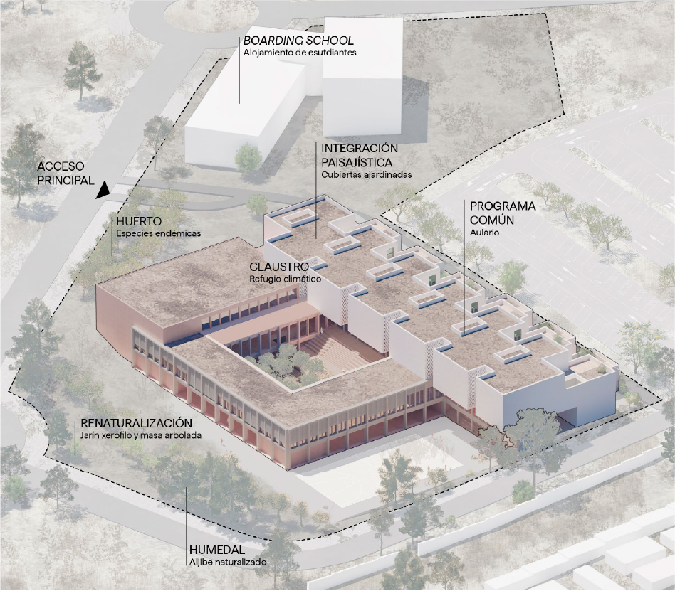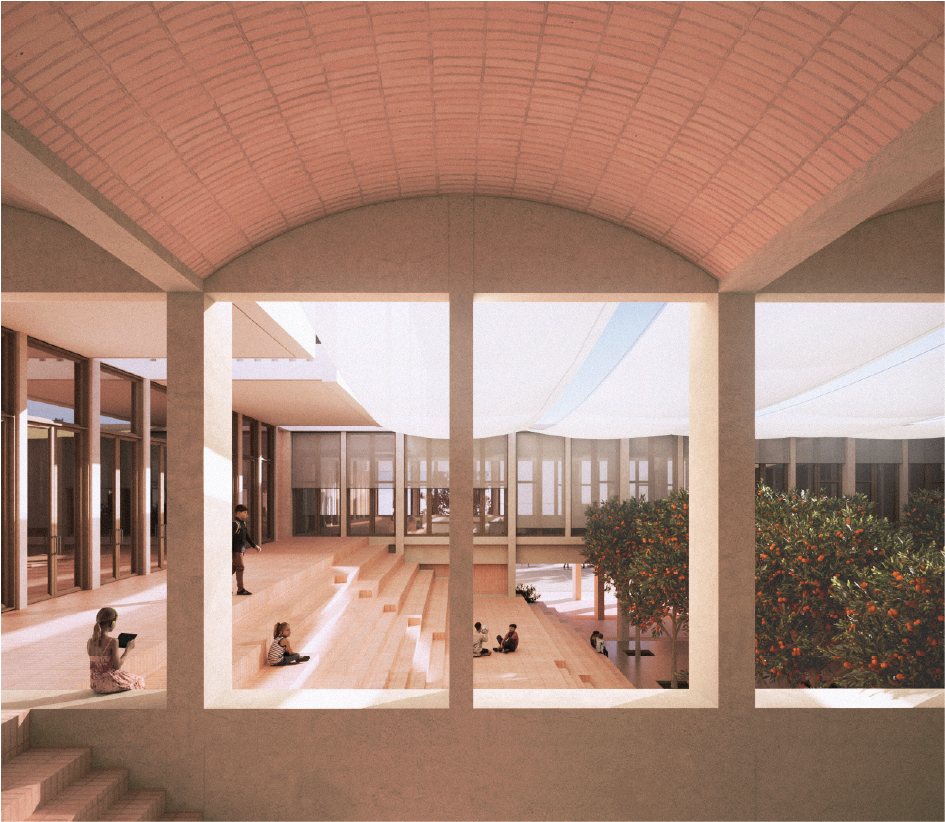 Reinterpretation of the traditional institutional typology —the porticoed cloister with a tree-lined courtyard— to provide the school with an iconic space and strong identity. Drawing on collective memory and fostering a sense of belonging, this space houses communal functions such as the dinning hall, library, gymnasium, and auditorium. Nature is integrated into the courtyard, acting as a climatic element and creating a refuge that welcomes and protects the students.