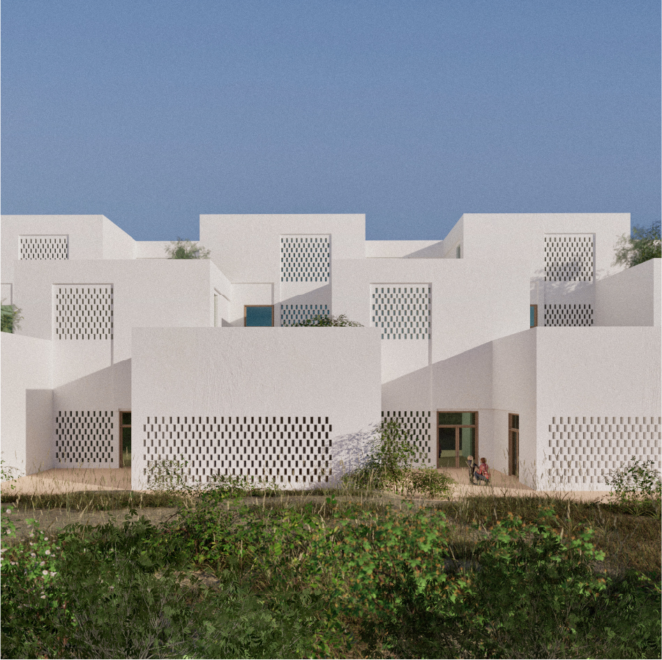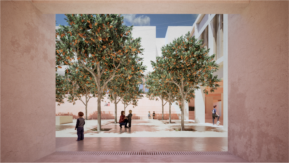 Terracing of volumes to blend with the local urban fabric. Usable flat roofs emulate the vernacular architecture of Níjar. Reinterpretation of the courtyard’s organizing role. Use of latticework and ceramic materials. Enhancement of the quality of the educational experience through the optimization of spatial conditions, such as north-facing orientation for optimal lighting. Nature is incorporated as part of an immersive pedagogical experience trough the creation of outdoor classrooms.