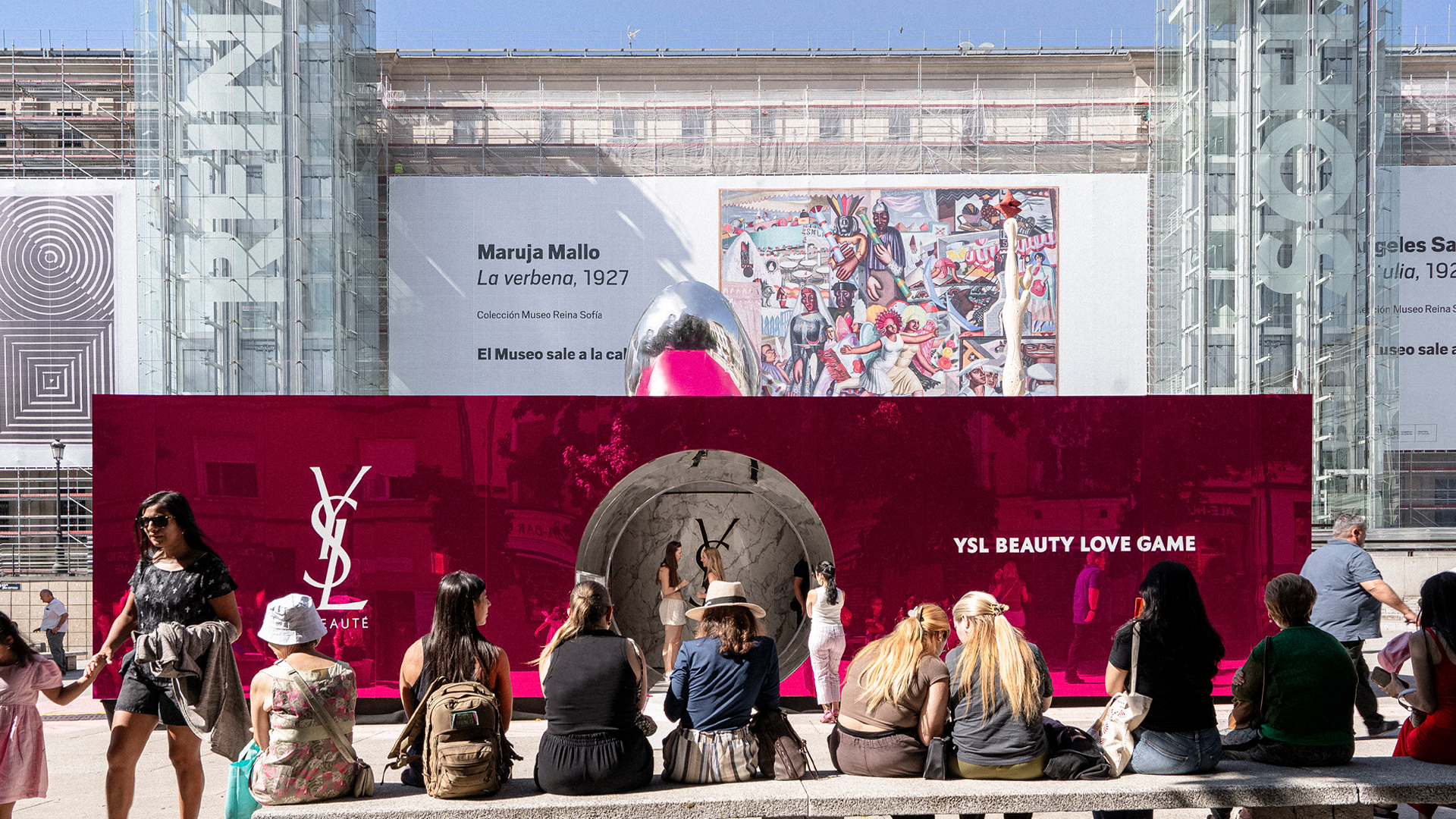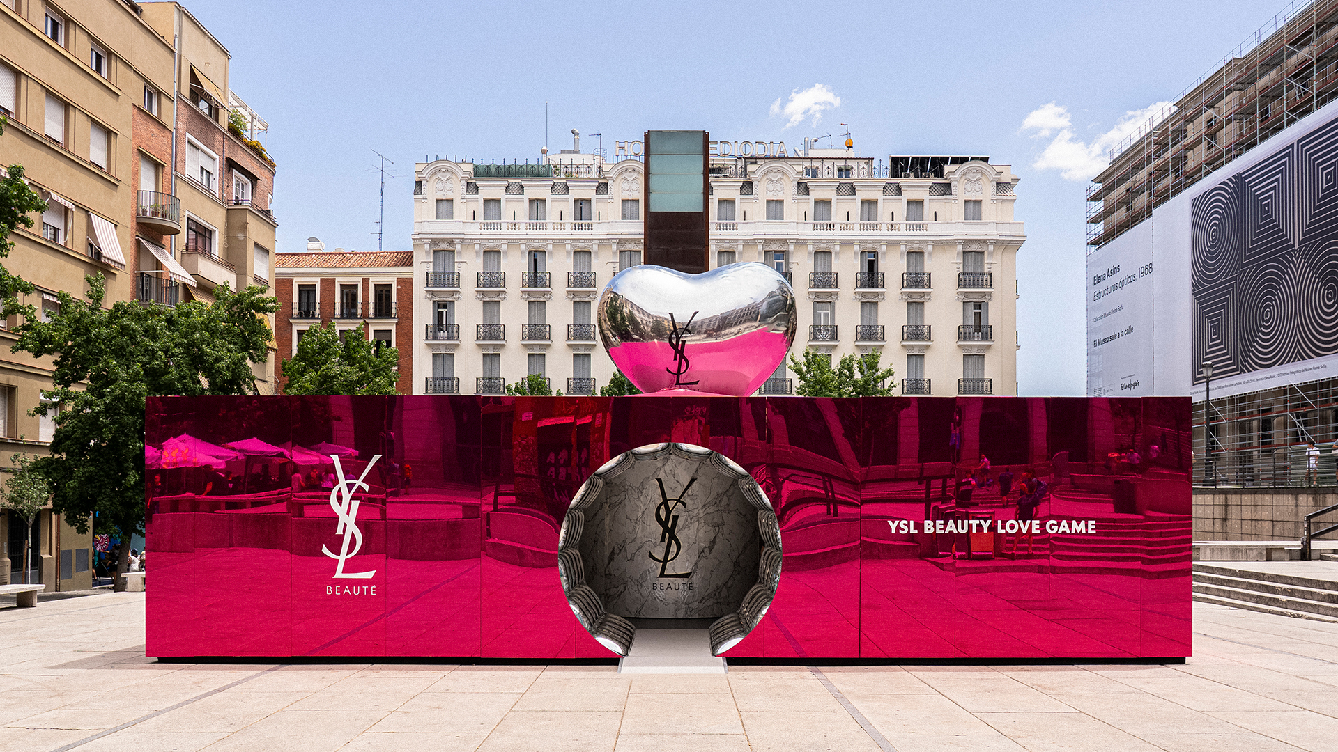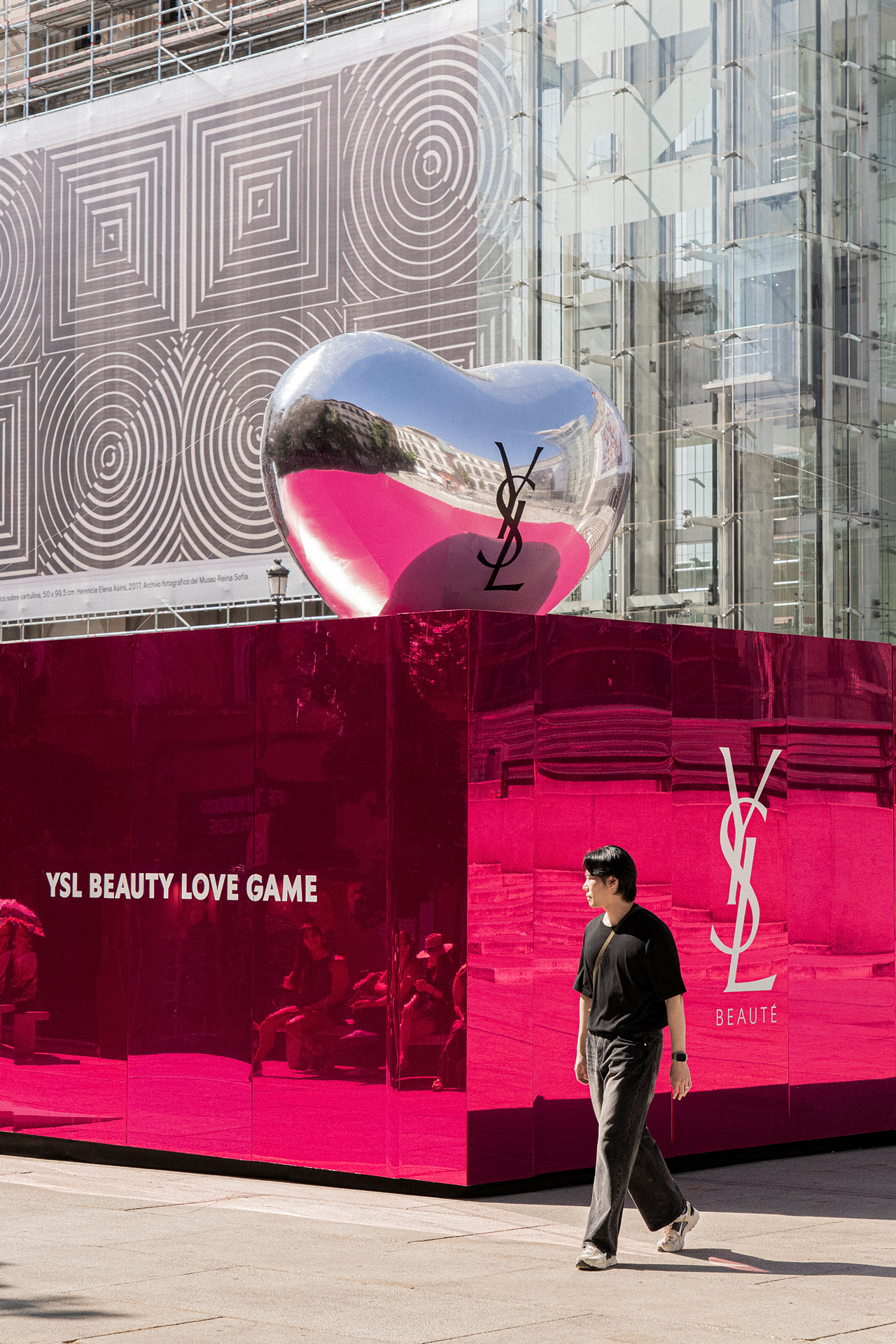 A temporary fiction emerges within the city’s everyday reality. The YSL Beauté Love Game pop-up is conceived as a spatial anchor for the Brand activation—designed to disrupt the routine and invite play. Its image is inmediate and iconic: a silver heart floating above the city, the central motif of the campaign, resting on a mirrored base that dissolves into the urban surroundings.