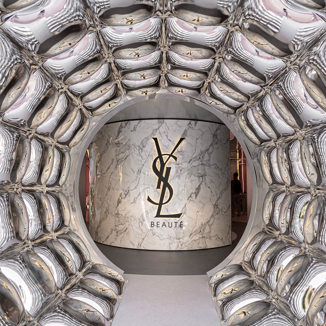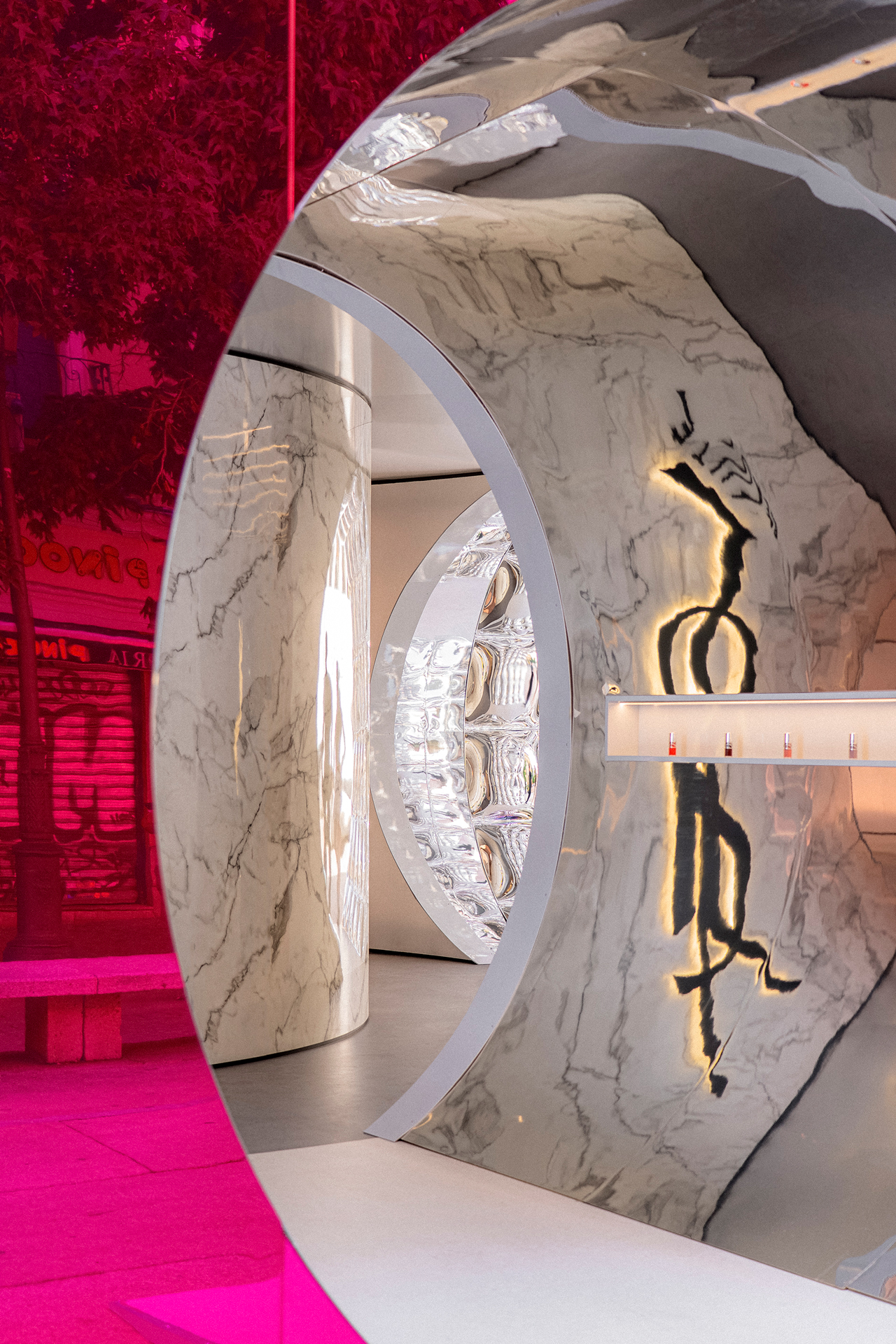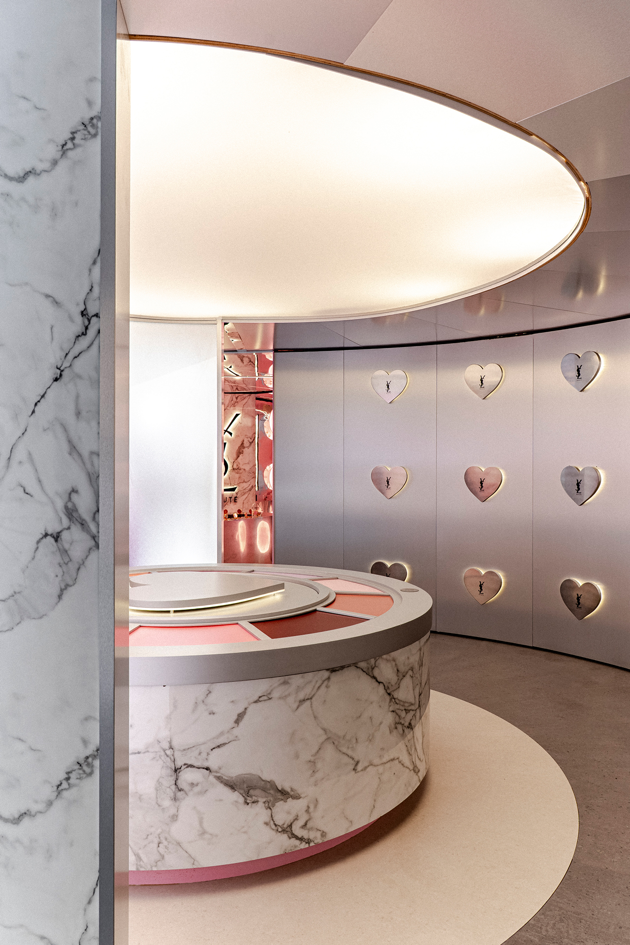 A temporary fiction emerges within the city’s everyday reality. The YSL Beauté Love Game pop-up is conceived as a spatial anchor for the Brand activation—designed to disrupt the routine and invite play. Its image is inmediate and iconic: a silver heart floating above the city, the central motif of the campaign, resting on a mirrored base that dissolves into the urban surroundings.