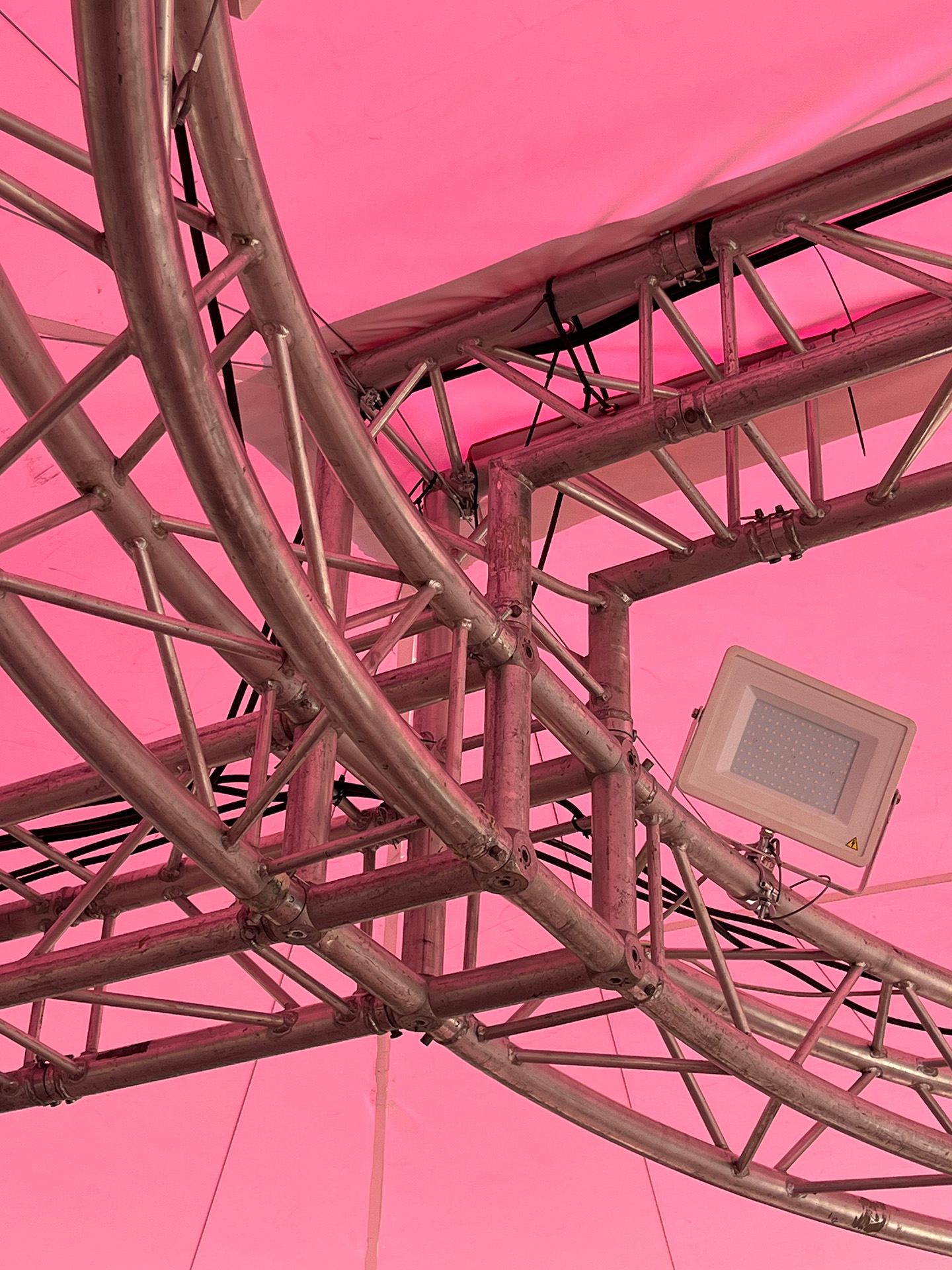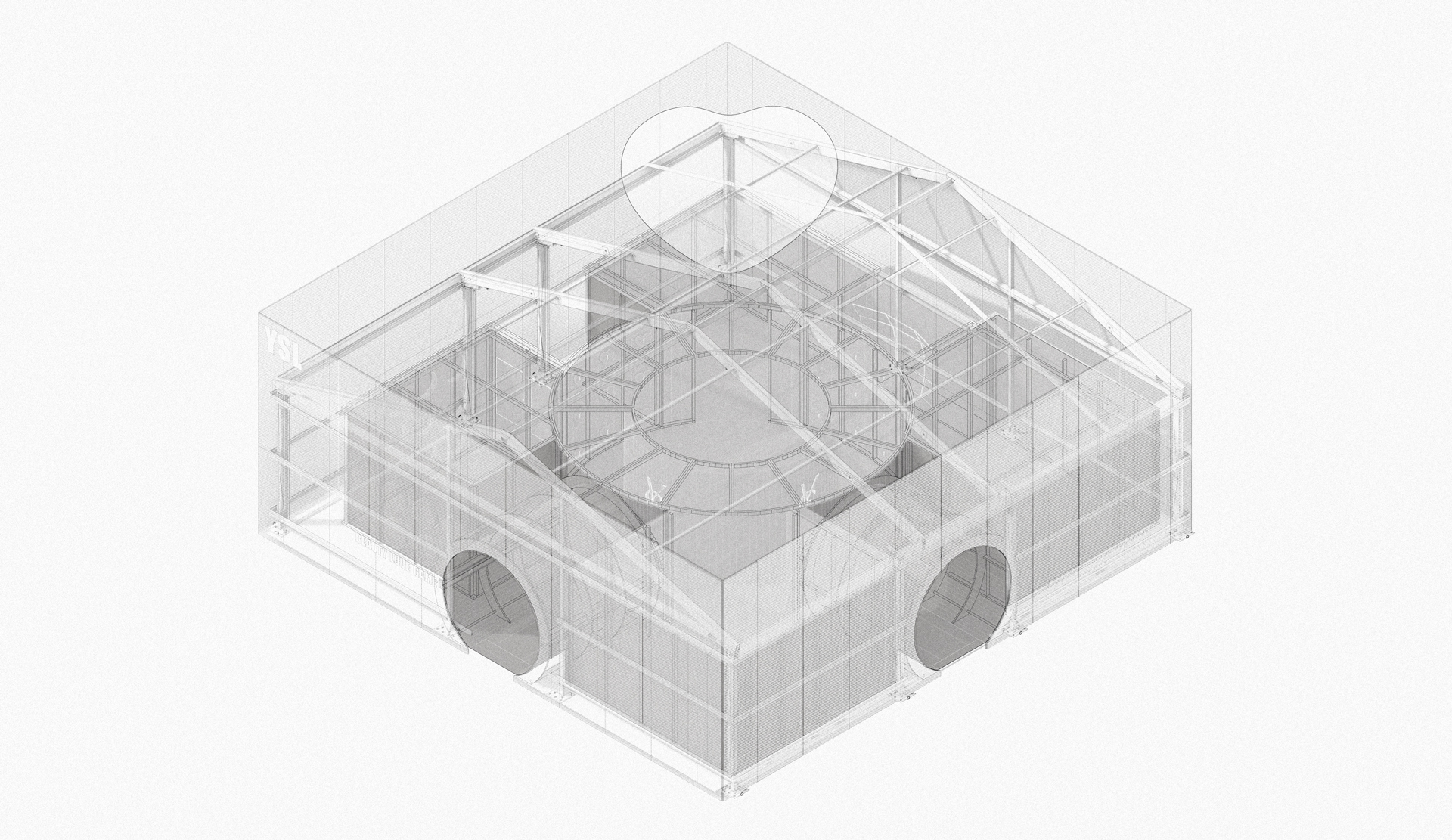 Engineered for transport within strict volumetric limits, the structure assembles in under two days, unfolding as a fleeting scenography. A travelling YSL anchor, momentarily emerging within the urban landscape.