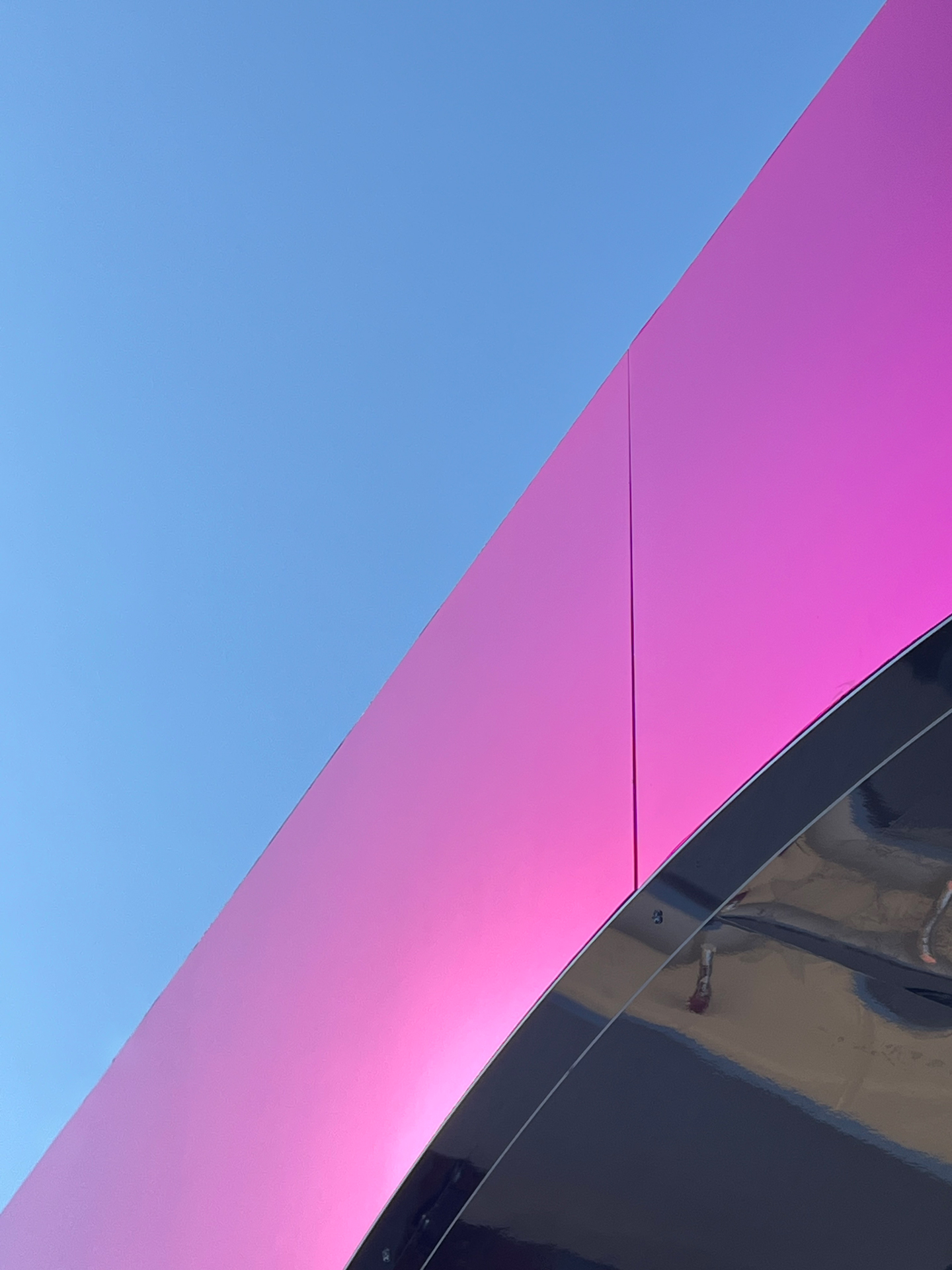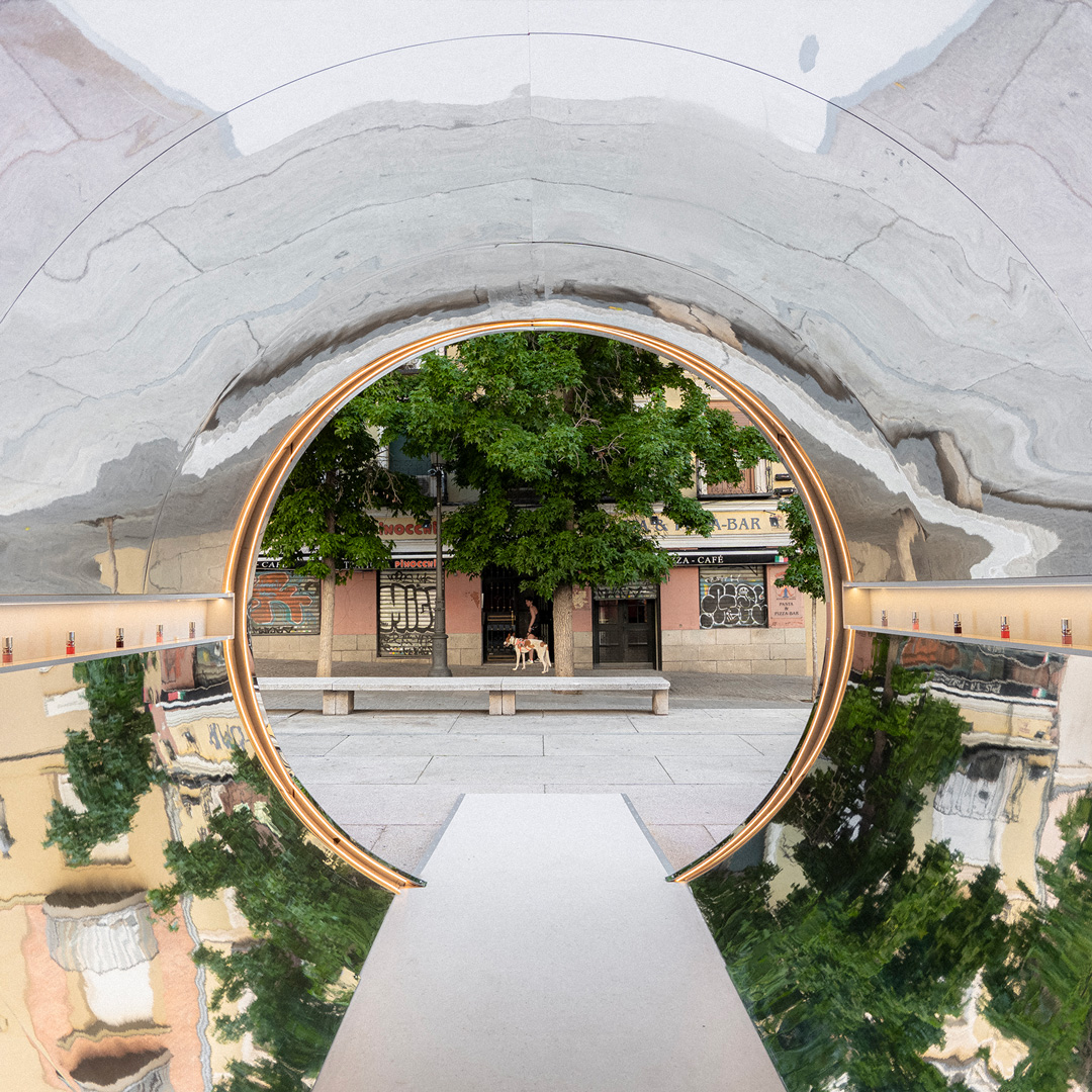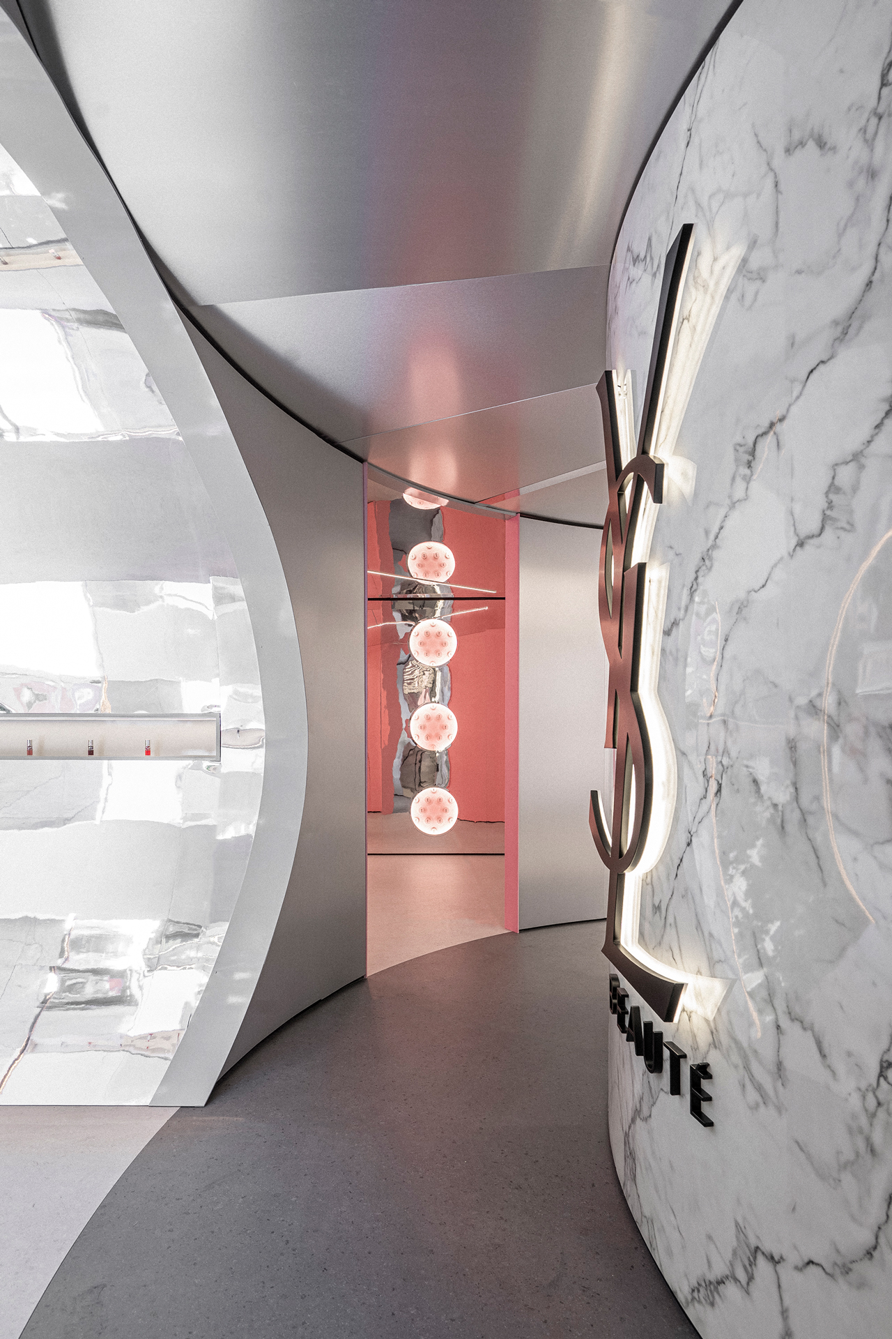 While its exterior remains neutral and reflective —an abstract object dissolving into its surroundings—the interior shifts into a choreographed sequence of spaces, experiential and photogenic, designed for circulation.
