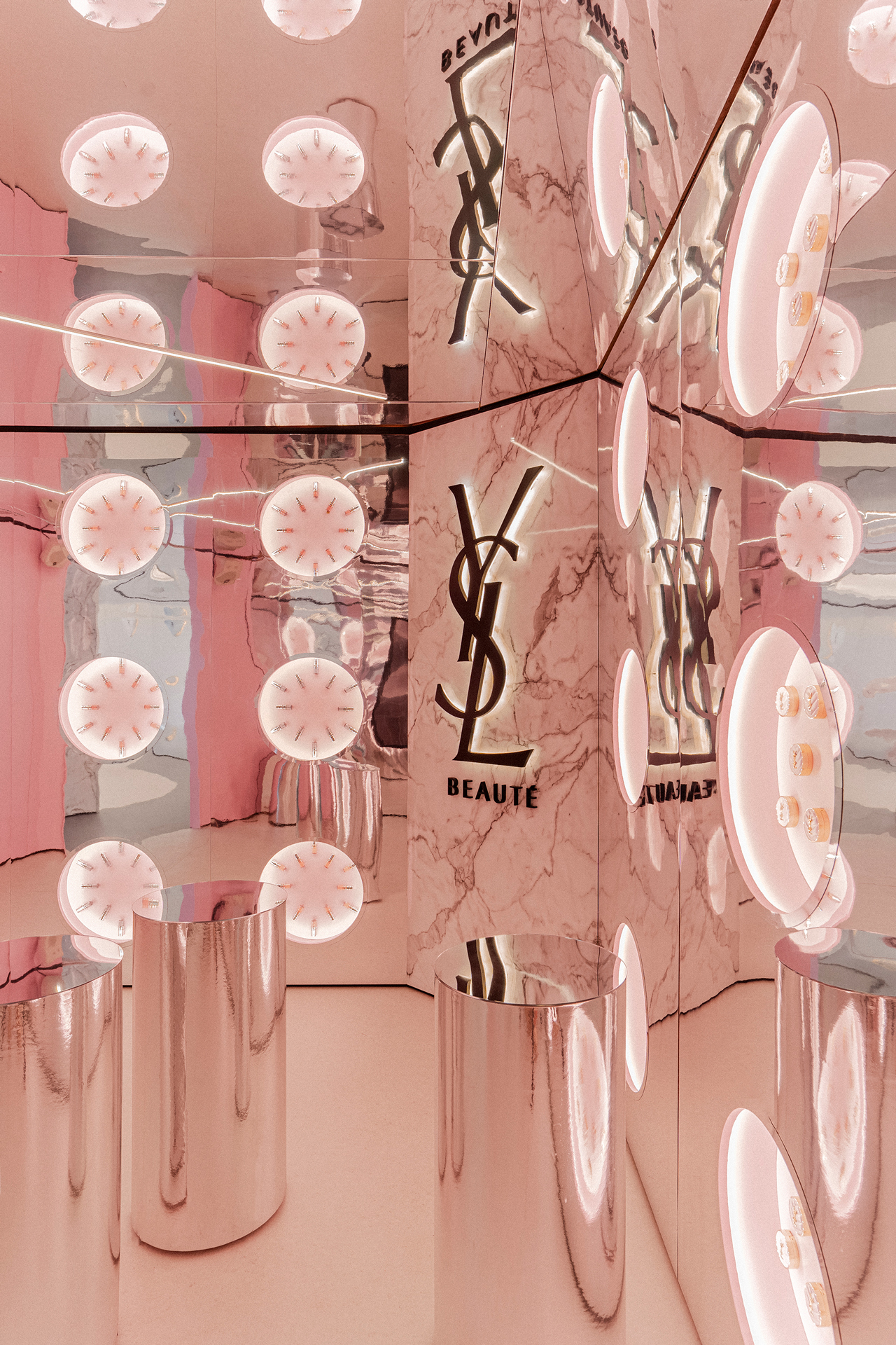 This central space articulates the pavilion and hosts the roulette—both as a literal installation and as a spatial metaphor—setting the rhythm for the experience. Around it, activation zones unfold: a photo call, immersive installations, and moments of surprise that draw visitors into the YSL Beauty universe.